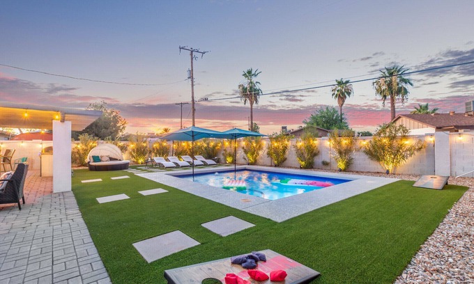 Only a 5 min ride to famous "Old Town" - Scottsdale nightlife, Spring Training, Golf Resorts, Camelback Mountain & Outdoor Parks. Home has 7 beds to sleep 10. Beautiful Resort style back yard with Pebble Tech Baja step pool, Hot tub, bbq island with mini fridge. Finished garage turned game room. Huge Patio to sit back and relax with a drink or play corn hole in the turf area.