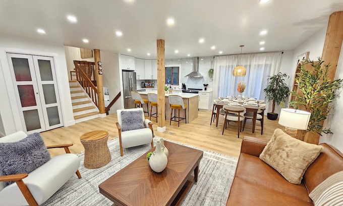 Spacious & Inviting: Open-concept first floor with a large living room, dining area, family room, and fully equipped kitchen