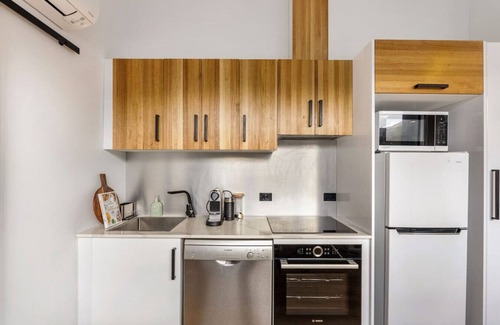 This modern one-bedroom home features a spacious layout ideal for both relaxation and productivity. The master bedroom opens to a luxurious, oversized bathroom, creating a hotel-like experience at home. A downstairs study with a futon provides extra sleeping space if needed. The fully equipped kitchen, complete with an induction cooktop, oven, and dishwasher, offers a seamless cooking experience. The open-plan living area is bright and airy, perfect for unwinding after a day of city exploration.