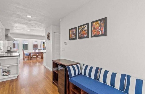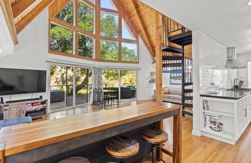 Pull through the gates to a parking area. As you survey the surroundings you notice the bocce court and seating area. A small deck fronts the entrance. A coded front door lock opens to an entry with bar table, and an open living room to your left. Stunning floor to ceiling windows allow amazing light and views, and sliding glass doors provide easy access to the large deck beyond. To your right a modern and updated kitchen has gas range, dishwasher, full size refrigerator and plenty of counter space for groceries and meal prep. Just beyond is a dining table for eight guests.