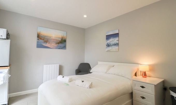 The exterior French doors provides access to the property. Inside you will find a double bed with fresh laundered white sheets. To your left you will find a Fridge, Microwave and a small storage space. To your right you will find a Kettle and Toaster and some complimentary Teas and Coffees. The room has a wall mounted TV and access to various apps and channels. The bathroom has a shower and washing facilities and has a modern feel to it.