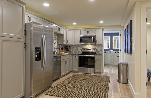 The kitchen is fully furnished with modern stainless steel cooking appliances, making it suitable for preparing any meal, from simple breakfasts or snacks to a three-course gourmet dinner. Spacious granite countertops offer ample space for culinary creativity.