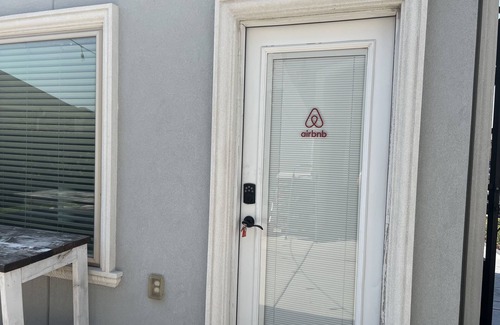 This is a detached studio (like hotel room) guest suite that is separate from the main house. We updated to a full sized bed to accommodate for 2 guests at a time. This is the only bed in the suite (additional guests would need to sleep on standard sofa). The room is located in the front of the house and has its own complete bathroom. You can park in front of house and go through main iron gate entrance. We have a projector mounted for your use with cable included.