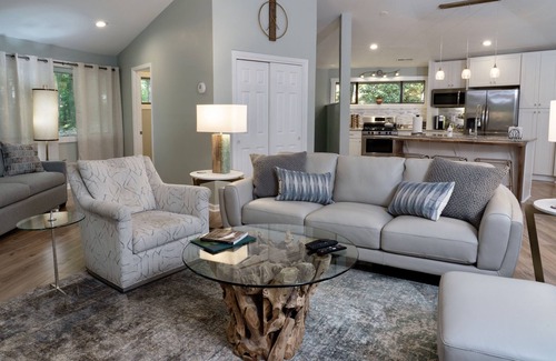 Welcome to your treehouse in the city! Perfect for Duke patients, professionals, & Durham getaways! Being nestled in a serene forest, you can relax and enjoy the sounds of nature in a quiet neighborhood very close to Duke University, Duke University Medical Center, the Duke Forest, and downtown Durham. It is also in the vicinity of the Research Triangle Park and the University of North Carolina at Chapel Hill. This property has been totally renovated and is artistically appointed. It is nestled between trees on a large lot within a quiet Duke Forest neighborhood cul de sac. A large open living area awaits you and is complete with a marble dining table that seats six. The living area is also beautifully furnished for you to watch the smart TV visit with your family, friends, or simply relax. Another section of this large room provides an additional queen sofa bed which serves as a nice reading area or an extra sleeping area. Your open kitchen is a great spot to prepare delightful meals or snacks while you visit with guests as they are comfortably seated in the living area or at the bar. Your circular great room opens to a wrap around deck with an outside table seating six. The view to the woods is fantastic, no matter where you settle. Downstairs are two newly furnished master bedrooms, one with a king bed and the other with a queen bed. Each of the master bedrooms has a full bath, and its own private patio. Like the upstairs deck, the downstairs patios are abundant with panoramic forest views. Between the two bedrooms is a small room with a twin fold out ottoman. There is also a separate laundry room with a large capacity washer and a dryer. A mesh wifi will keep you connected throughout the house. Additionally, a Ring doorbell system is in place for your safety. Parking is available in your private driveway or on the street in front of your house. Hiking is nearby on the Al Buehler Trail. We cater to guests visiting Durham and Chapel Hill, Duke patients and people with asthma and allergies, Even the most finicky would find comfort in this home!