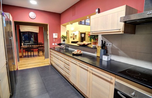 Escape civilization in Plana Novella. Enjoy stunning views of the mountains and peace and tranquility rarely found along the Spanish coast. Located in a secluded neighborhood in the middle of a national park, only 6 miles to popular beaches and 8 miles to the beautiful town and beaches of Sitges. Swimming pool, child-friendly 5 bedrooms, 4 full bathrooms; hardwood floors throughout, a large (45m2) living room with double-high ceiling and fireplace, large open modern kitchen, 3 terraces including a romantic secluded one off the master suite. Recently completed to the highest standard, it is fully equipped w/ broadband internet, WIFI, Wii video game console, TDT TV, stereo, A/C, central heating, washing machine, dryer, dishwasher, induction stove, convection oven, microwave, 2 fridges, and BBQ. Recently added petanque/bocce court for leisurely afternoon fun. Come celebrate any holiday in Garraf!