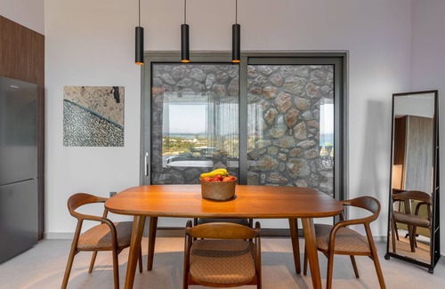 Upon entering Villa Omega, you come into the large living space which is filled with natural sunlight through the glass panel doors. On one end is a fully equipped kitchen with a dining setting and a spacious lounge and dining setting. The large glass panel doors create an indoor-outdoor experience that is everything you expect when renting a Villa in Greece.