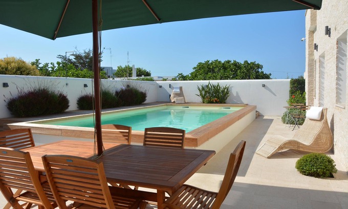Private and modern Mediterranean summer villa, located in the best area to explore most famous Apulia's sites. A gorgeous pool, a panoramic sea-view and a charming rock garden, with a 200 year old mulberry tree, makes Villa Isabella a wonderful retreat from the stress of daily life. Cool and contemporary, it is packed with comforts: three en-suite double rooms, air conditioning, cleaning service, Wi-fi, TV, Security services, three outdoor eating areas - two at ground level and one at roof level - with barbeque and a ventilated sun deck where relax and watch stars. The villa can comfortably host a family or three couples due to its well-planned layout that preserves privacy and freedom for each double room. The villa embodies dynamic spaces for continuous enjoyment; choices are made between a luxury sunlight garden, a sheltered patio, or the quiet and cool interiors. During your day you can choose to enjoy the sunny and seductive pool, where you can easily bring out breakfast and lunch from the adjoining fully equipped kitchen; or you may decide to spend your day at the roof terrace, overlooking the surrounding countryside and the sparkling blue sea. Mediterranean herbs and cactus planted at the roof garden will immerse you in the energizing and rich atmosphere of summer. Interiors of Villa Isabella are designed and decorated with the aim of maximizing the light of Puglia and to provide you with comforts. Local Puglia's stones used for the outside areas and Tuscan handmade “cotto” tiles placed at the interiors, merge seamlessly with contemporary lines and rustic-chic elements, striking the perfect balance between modern comfort and ageless charm. The main entrance leads into a white, open concept living and dining area, with a sofa and a fully-equipped kitchen with a dining table. Two bedrooms lead off from the dining area have their own communication with the outdoor and swimming pool areas. All doors and windows have wrought iron grills and mesh screening to allow windows to be left open but keep insects out. Villa Isabella lies 100 meters from the coast and 5 minute drive, or 15 minute walk, from the charming fishing village of Torre a Mare. The location of villa Isabella and its high quality of spaces offers you chances not only to relax but also to plan one day trips to gorgeous UNESCO places, like Alberobello and Matera, or outstanding natural areas as the Torre Guaceto natural reserve and Polignano a Mare.