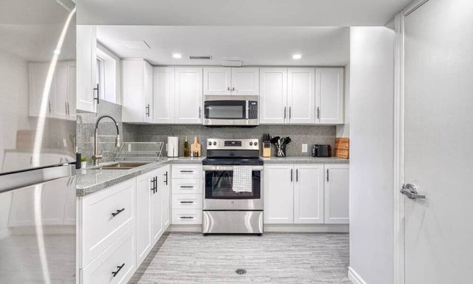 It has a fully equipped kitchen, living room with 55' Smart TV, high speed internet, and glass encased tub in washroom to meet the needs of any guest!