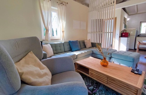 Going upstairs, you'll find a fully equipped kitchen and living room. The kitchen is spacious and modern, with all the utensils and appliances you need to prepare delicious family meals. The living room is a cosy and inviting space, perfect for relaxing after a day full of adventures in nature.
