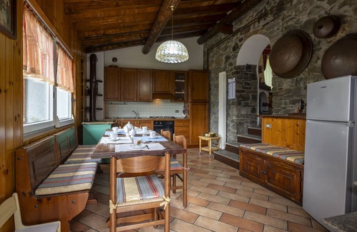 5-room semi-detached house 133 m2 on 2 levels. Spacious, practical and comfortable furnishings: open dining room with dining table, TV and tiled stove. Open living room with open-hearth fireplace (only for decoration). Open living/sleeping room with 1 double sofabed. Exit to the garden. 1 double bedroom. Large kitchenette (oven, dishwasher, 5 gas rings, toaster, kettle, microwave, freezer, electric coffee machine, Capsules for coffee machine (Nespresso) free). Shower/bidet/WC. Upper floor: (spiral staircase), 1 room with 2 beds. Exit to the terrace. Heating. Terrace, garden. Panoramic view of the mountains, the valley and the garden. Facilities: washing machine, children's high chair, baby cot, hair dryer. Internet (WiFi, free). Please note: suitable for families. Non-smoking house. Maximum 1 pet/ dog allowed. Smoke alarm, fire extinguisher. IT014069C2Y9AD8B5X