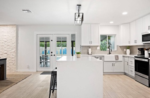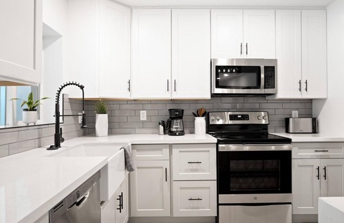 The kitchen has an island, new appliances and modern finishes. It is fully stocked for both indoor and outdoor cooking - just bring your groceries!