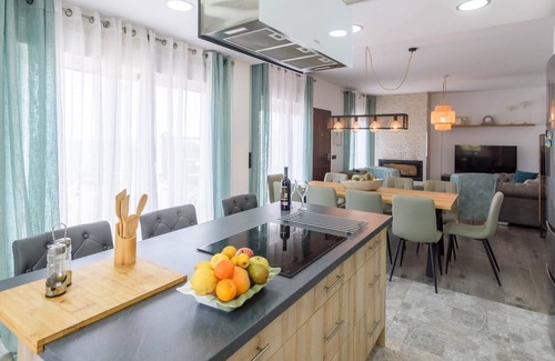 On the main floor there is a modern living room and a fully equipped kitchen. There are also three bathrooms and four double bedrooms, one with a double bed and en-suite bathroom and two with a double bed.