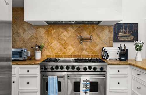 Designer kitchen equipped with six-burner Viking Gas Range, farmhouse sink, and Sonos sound system. Large center island with bar-style seating, views of the yard, and access to outdoor dining area.
