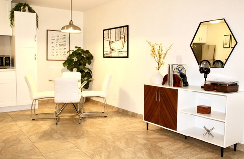 The main living area offers plenty of seating with couches, a dining table for four and extra seating at the bar. The open concept floor plan connects to the fully stocked kitchen with brand new stainless steel appliances and freshly painted cabinets. To maximize space, we’ve even included a fold-out desk for your convenience. Step out onto your covered patio overlooking the courtyard to enjoy coffee or a cocktail or turn on the provided record player to relax and unwind from the day.