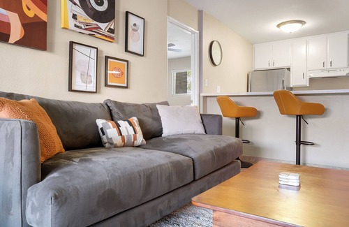 Upon arrival, you’ll be greeted by a lush courtyard that offers plenty of shade and feels like an urban respite in any season. Our second-story condo is brightly appointed with colorful modern furnishings, cool tile floors and updates throughout.
