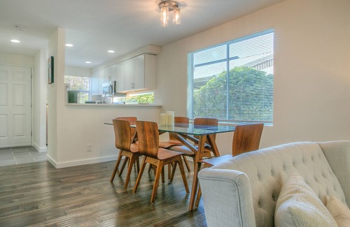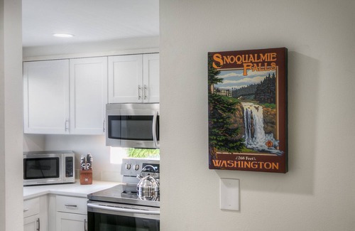 Location: Moon River Suites #1 is located on Main Street in downtown North Bend. Out front is a great view of Mount Si and downtown is a short few blocks walk. Out back, enter another world with your private hot tub, barbecue on the banks of the South Fork Snoqualmie River. The building and grounds have been totally updated to present a modern getaway in a classic Pacific Northwest setting along the river next to a park. Beyond the park across the street is a beautiful wooded walk along the river which will eventually connect to the Snoqualmie Valley Trail should you choose to go that far. Easy access to all that North Bend has to offer: hiking, biking, Snoqualmie Valley Railway, Snoqualmie Casino, Dirt Fish Driving School, Compass Mountain Bike Tours, outlet mall, breweries, wineries, restaurants, Golf, Skiing, River Rafting, Fishing, movie theater, etc.The space: Moon River Suites #1 is a two story townhome with 1100 square feet of living space. You will have 2 bedrooms, a full bath and balcony with river view upstairs. Downstairs is a fully equipped kitchen, dining and living area and half bath. Outside on the deck is your private hot tub and barbeque. All the furniture, appliances and supplies are brand new and selected for your comfort and enjoyment in modern style.