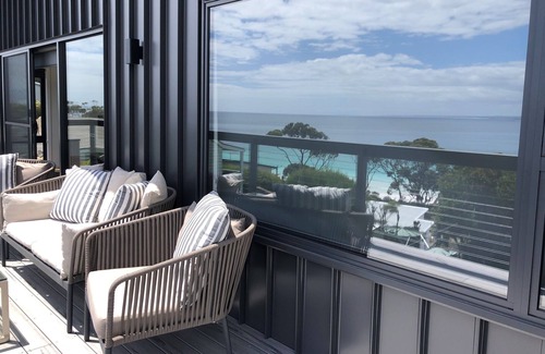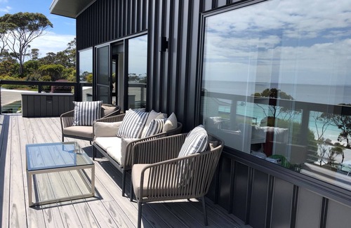 The master bedroom has a king bed, with modern ensuite bathroom and storage. Wake up to amazing views of Binalong Bay Beach, and the Bay of Fires.