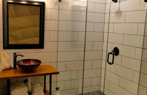Our geodomes are the first in the United States to feature indoor plumbing, HVAC, and electricity! The style blends contemporary with comfort, featuring exposed metal piping, butcher block shelving, and pebble shower floors in the custom bathroom. You'll find a king-size bed, a table for two, and a cozy seating area facing the expansive picture window. The kitchenette, equipped with retro-style appliances, completes the space. These geodomes are blissfully free of televisions, allowing you to unwind fully in nature's tranquility. From the window, enjoy sweeping views of the lush forest, where the changing seasons transform the landscape—vibrant green in spring and summer, brilliant hues in fall, and a serene winter wonderland when snow falls. The peaceful ambiance of the woods invites you to relax and unwind, bringing the beauty of nature right into your geodome.