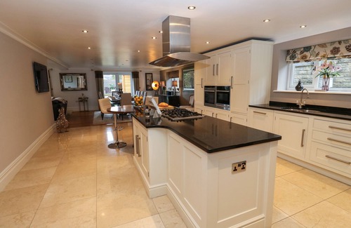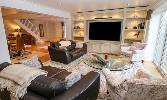 Amenities: Electric oven and gas hob, combi microwave/oven, fridge/freezer, fridge, wine cooler, 1 x dishwashers, washing machine, tumble dryer, coffee machine, kettle. 5 x Smart TVs, 80 inch TV in main lounge area. Fibre-WiFi. Fuel and power inc. in rent. Bed linen and towels inc. in rent. Designated parking for up to 3 cars. Enclosed multi-level garden with lawn, patio, oak lodge summer house with bifold doors, furniture, and barbecue. Two well behaved dogs, to be kept downstairs. GAS BBQ Sorry, no smoking. Shop 0.7 miles, pub 0.4 miles. Note: Three steps up to sunken bath in the first-floor bathroom