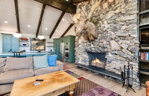 great room with moss-rock fireplace, an updated kitchen, and one of Estes