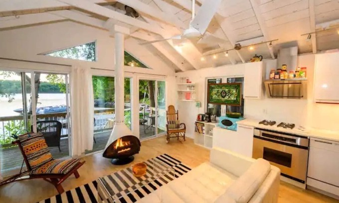 In Lake House Upper, 25 feet of glass windows showcase stunning lake views. The entire light-filled space has been completely renovated with a modern aesthetic, central A/C, high-speed internet, a flatscreen TV, and a modern gas fireplace. With an open layout and multiple seating options, there is plenty of space to gather and enjoy a cozy fire and lake views.