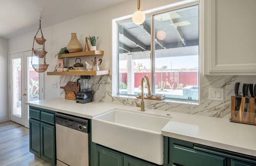 This home has been lovingly transformed into a modern, chic, desert dream. Designed to be a desert haven where you can truly getaway from the hustle and bustle of life and connect to the powerful energy of the desert. Rest and recharge in our restorative retreat. Inspired by the natural elements of the desert. Bringing in raw natural texture with jute rugs made in India. Hand crafted natural stone sinks flown in from Bali. A custom handmade live edge table made of monkey pod wood. Imported handcrafted wall hangings made by the indigenous artisans of Peru. Beautiful unique pendant lights made of natural elements; rope, wood, and metal to create a warm and unique ambiance in each room. Enjoy the gorgeous natural light that streams into the house throughout the day as well as the indoor-outdoor living with French doors in the dining room and master bedroom that open out directly to the private back patio, pool spa area.