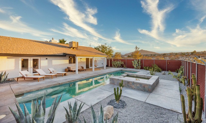 Welcome to the magical desert oasis. Our newly renovated home sits on 2.5 acres. Meticulously designed with Moroccan and modern inspired elements throughout the home. Incorporating handcrafted pieces from Peru as well as luxury memory foam mattresses. Enjoy epic star gazing from the hot tub, refreshing day night/swims in the in ground pool and yoga, sound bath meditative experiences in our large converted yoga studio.. Open the garage doors to take in the beautiful desert landscape.