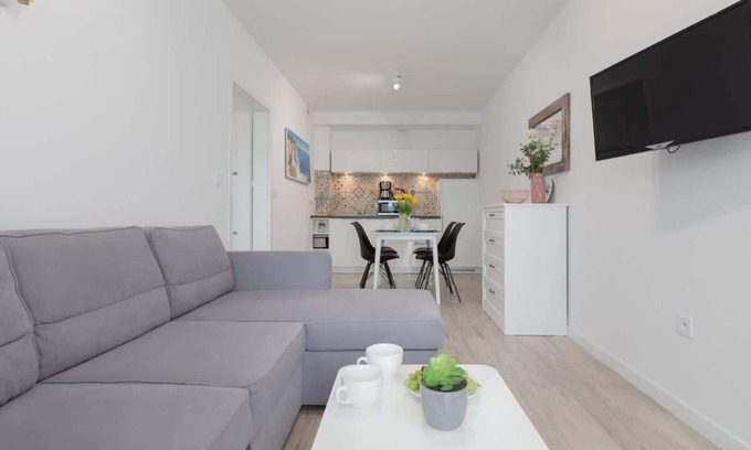 The 38 m² apartment has the ability to accommodate up to 4 people. It is a great choice for a family vacation or a friendly trip to the sea! It consists of a living room with access to a balcony, a fully equipped kitchenette, a bathroom with shower and toilet and a bedroom. The living room has a Tv and a corner sofa. Together with the associated balcony, it makes a great place for rest and relaxation. The beautifully decorated, bright bedroom has a large, comfortable double bed and a Tv. The apartment has access to high-speed free Wifi internet. Equipped with the necessary kitchen and bathroom accessories guarantee a comfortable stay. Parents traveling with children will also find equipped with a crib and highchair for their little one. The property is of a high standard, distinguished by its functionality and aesthetic finish.