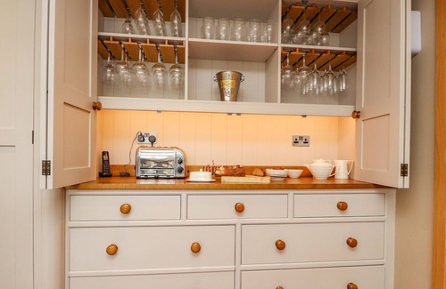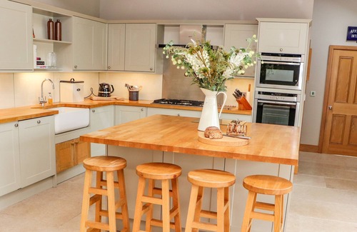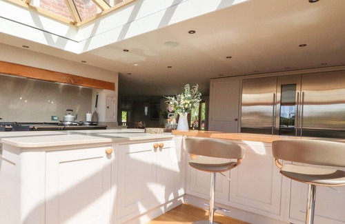 This detached house has two open-plan living spaces, a utility and snug. On the lower-ground-floor, there is a games room, study, cinema and gym. Amenities include an AGA, two electric ovens, two gas hobs, two microwaves, fridge, freezer, fridge/freezer, washing machine, tumble dryer, dishwasher, and wine cooler. Entertainments include three Smart TVs, cinema screen, surround sound, pool table, table football and selection of games. Bedrooms include a super-king-size with en-suite, lower-ground-floor super-king-size zip/link, king-size with en-suite, double with en-suite, ground-floor double, and twin, with a ground-floor shower room, lower-ground-floor shower room, and a cloakroom. Outside, there are enclosed gardens with hot tub, furniture, tennis court, and barbecue hut. Within 4.5 miles, there is a shop, and within 2.5, a pub. Sorry, no pets and no smoking. WiFi, fuel, power, bed linen and towels included. Choose Moss Cottage Farm for a large family gathering in the countryside.
