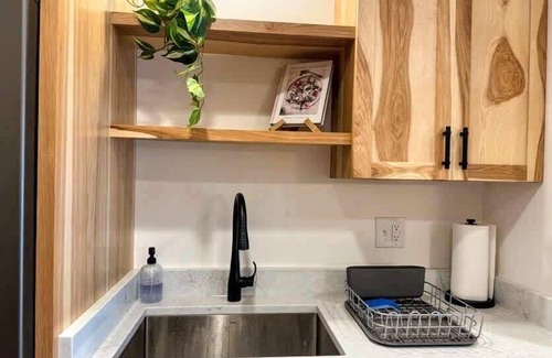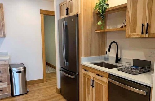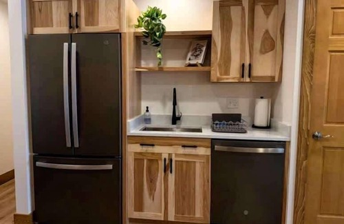 Inside, you’ll find an open living area with a cozy fireplace, a fully equipped kitchen stocked with cookware and extras, and all the comforts of home — including air conditioning, High Speed Fiber Wi-Fi, Smart TV equipped with Sling + popular streaming apps for guest login. Family-friendly touches like a bathtub, children’s dinnerware, outlet covers, and room-darkening shades make traveling with kids a breeze.