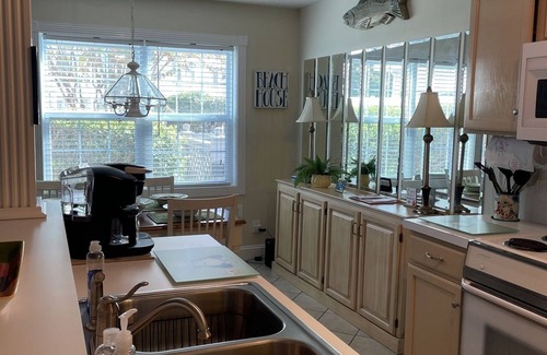 This unit newly remodeled 11/1/2020 comes with a fully equipped kitchen with dishwasher, microwave, Keurig single & 12 cup coffee maker, toaster oven, Washer and dryer in the unit. There are three tv's, a DVD player. High speed internet service. The covered patio overlooks the pool area.