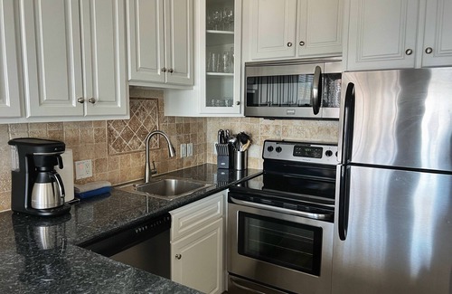 • KITCHEN: fully equipped, stainless steel appliances, full range oven, full-size fridge, 12 cup coffee maker, blender, mixer, toaster, electric griddle, wine and champagne glasses.