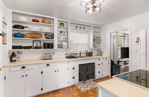 Our kitchen invites you to hang out and cook together, just like at home. It is white and bright, with sunlight streaming in during the day. You’ll have all the appliances, cookware, and dishware you will need. Plus lots of counter space and a butcher block cart.