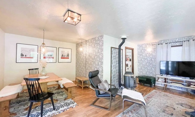 The dining area is open to the living room, making it effortless to interact between the two. Brass pendant lights above set a nice mood while a boho rug and more forest owl wallpaper continue the woodland theme. Enjoy home-cooked meals at our wooden table which seats eight guests. And after dinner, settle in for a family game night with cards, Scrabble, Jenga, Bye, Felicia! and much more.