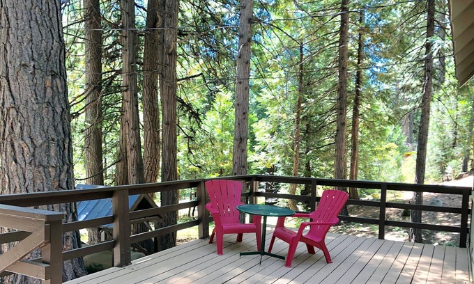 This cabin was built in the 50's and is surrounded by towering redwood trees and has a large deck for relaxing. Enjoy sitting on the deck in spring and summer and bird watch. There is both a floor furnace and a wood fireplace with an insert which quickly heats the cabin. There is firewood available onsite. All the beds have down comforters and pillows, and flannel sheets.