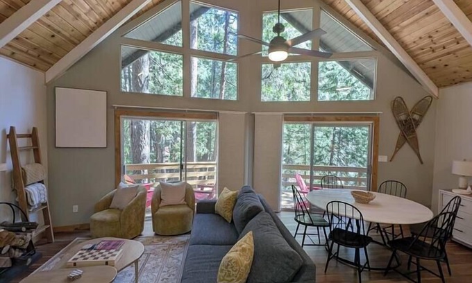 Nestled amidst towering redwoods, our serene vacation home near Kirkwood Ski Resort offers the perfect blend of privacy and comfort for up to 12 guests. Unwind by a cozy fireplace, create intimate gatherings and cherished memories. Embrace fun-filled evenings in our game room, or relax under the stars after a long day on the slopes in by the fire. With ample parking, convenience meets tranquility in this enticing retreat, beckoning you to indulge in the ultimate mountain getaway.
