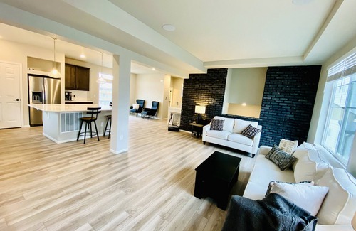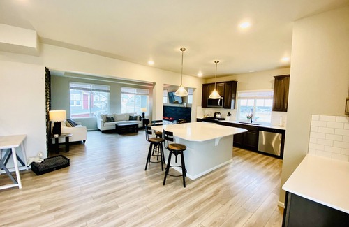 We are so excited to welcome our guest to a brand new construction home with accommodating renovations! Two full living rooms on the first floor and on the main floor with plush couches + TV with streaming services and cable, that sits next to the GORGEOUS new fireplace to cozy up this winter in Colorado. The living area is near the large open layout kitchen with inviting guests and entertainment with the huge island, brand new gas stove and natural lighting.