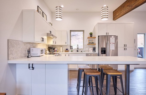 From the moment you step through the door, you will see what we love about this home. Modern decor throughout, an open concept floor plan, and several windows that provide picture-perfect views of the mountain-esque environment that surrounds…an all-around fantastic place to be! Once inside, head into the kitchen, a bright and stylish space equipped with everything you need to enjoy a home-cooked meal in the mountains. Because the kitchen overlooks the living room, the chef of the group won’t miss out on any vacation conversation, and they don’t have to worry about missing any games being broadcast on the smart TV. The rest of the group can simultaneously enjoy entertainment from the comfort of the couch, whether taking in the view or tuning into your favorite Netflix series!