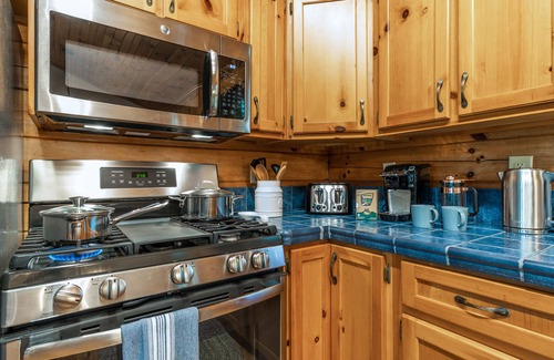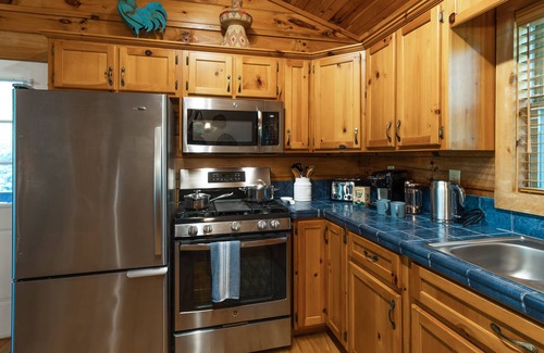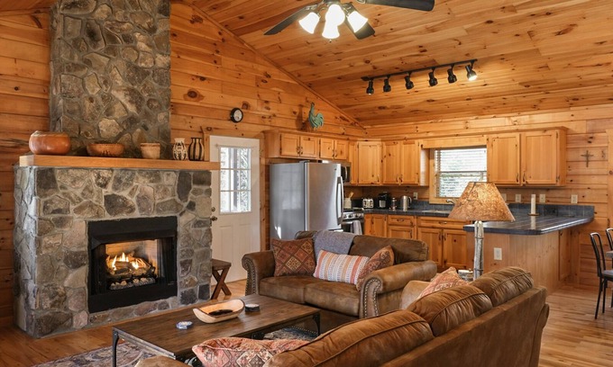 Entertainment is provided by a new 65-inch 4K smart TV (Prime Video, Netflix, YouTube, etc.) in the living area, as well as a TV with Roku in the principal bedroom. High speed Wi-Fi internet access is provided, and a desk offers a dedicated place for laptop sessions in the common area. Board games and cards are provided for fun evenings. A Weber propane grill sits just outside the living area, and the large open kitchen (supplied with all new cutlery, chinaware, pots, pans, and equipment) features a gas oven and stove with a flat griddle built in. A remotely controlled gas fireplace in the living room offers ample warmth and a soothing ambiance on cold nights, while a central HVAC system delivers heated or cooled air to the cabin as needed. Ceiling fans in the living room and each bedroom enhance year-round comfort.