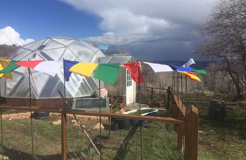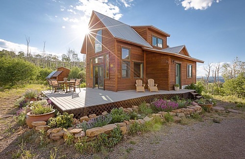 Situated on Hastings Mesa 25 minutes from Telluride at an elevation of about 9,000 feet, the 52 acre property is rimmed by mountains in the distance with views of North Pole Peak, and Hayden Mountain. From the patio, view Elk and wild turkey as they roam the old growth aspen forest, sage fields and scrub oak. A wood-burning sauna allows guests to detox and sweat out stress. A trail climbs up for 1.5 miles to the properties highest point. There hikers are able to take in views of some of the regions most beloved landmarks. The home itself, though only 1,100 square feet, feels spacious and warm. Perfect property for dogs, we encourage you to bring them to enjoy on hikes throughout the mesa. An amazing alpine greenhouse provide a large assortment of fresh vegetables including lettuce, kale, peppers, tomatoes, artichokes,figs and an assortment of herbs to be used by our guests. Relax inside and enjoy the humid tropical air. The combination of the scenery along with the greenhouse makes for a unique eco retreat that connects you to the land and brings a sense of calm that will leave you invigorated when you leave.