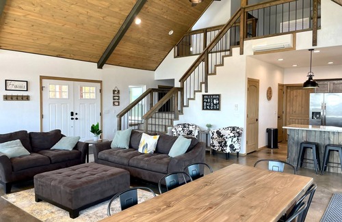 When you walk through the beautiful double doors of the cabin you will be greeted by a sun filled, open concept living space with a grand fireplace centered in the room. The living room features 2 couches making it the perfect place for your group to gather around by the fire place. The large living space also has a little seating nook directly behind the couches with fun cowhide chairs perfect for curling up with a book & a cup of coffee.