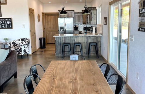 Adjacent to the living space in the dining area is a large modern farmhouse dining table with seating for up to 8. The peninsula countertop island also showcases 3 bar top seats to accommodate more guests, or making a great place to grab a quick bite to eat.
