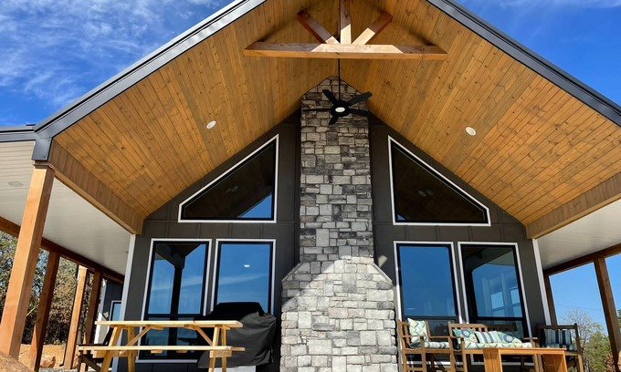 The Blue Bear View has everything you need to escape the city and relax with breathtaking views of Sardis Lake & the surrounding rolling hills. The cabin is complete with 4 bedrooms, sleeping up to 10 guests, with a large open living space, a breathtaking kitchen, a full game room, luxury bathrooms & a stunning stone fireplace. Outside the entertainment continues with a picnic table, outdoor living space, yard games, wrap around patio & a firepit all overlooking the lake below.