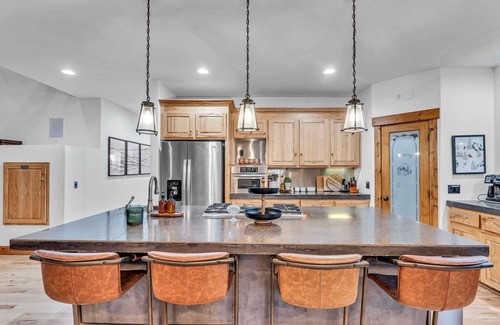 The master suite is conveniently located on the main level, with 2 additional bedrooms upstairs, providing a blend of shared spaces and privacy. For even more flexibility, a cozy living area includes twin bunk beds and a twin bed with a trundle, making it a great space for extra guests or kids. A separate apartment, accessible through the garage, offers a full kitchen, laundry facilities, and multiple beds—perfect for teenagers or guests who prefer their own space. Every bedroom features a Smart TV, and the private backyard hot tub offers a peaceful place to relax. Whether you’re gathering in the inviting living room by the wood-burning fireplace or grilling on the deck, this chalet has everything you need for an unforgettable family getaway.