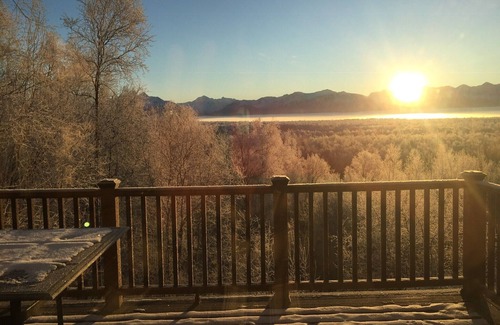 Enjoy the beautiful Matsu Valley in our lovely loft bedroom. This space has a breathtaking view of the Chugiac mountain range from your private deck with private entrance . This is a cozy private bedroom and private bath with mini fridge, microwave and coffee.