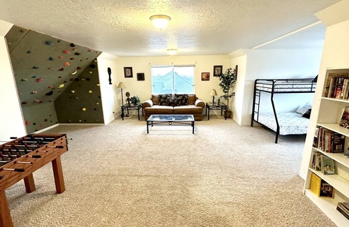Inside, our home boasts a bouldering rock wall, adding a touch of rustic fun to the interior spaces. It also comes equipped with several full bookshelves, a game closet for hours of entertainment, as well as toys for little children while you're traveling, and a backyard playground.