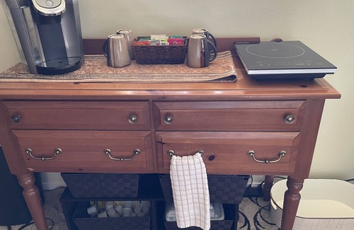 More then ample parking leads to your private entrance to your private 1,500 square foot of living space with two bedrooms, a full bathroom and a large living area. Your kitchenette area is fully stocked and has a large fridge with freezer, micro-wave, Keurig coffee, blender, hot and cold water dispenser, a hot plate with cooking pots and pans.