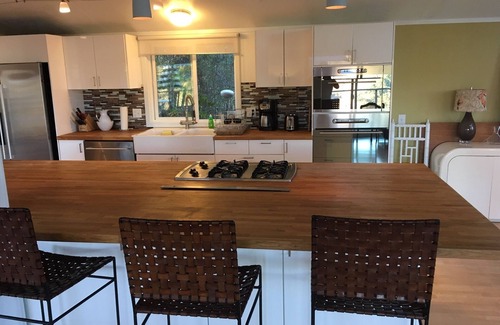 The kitchen is newly remodeled farmhouse style with new appliances and deep sink, and an island with a stovetop, designed for eating and socializing during cooking.