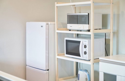 The kitchen is equipped with a freezer, as well as a microwave, cookware, and a rice cooker. And because there's access to laundry facilities, you can go a bit lighter on your packing.