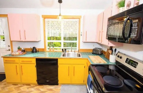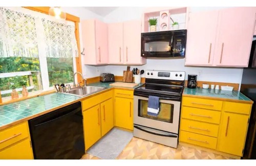 The kitchen is equipped with a small coffee maker, a pour over, a single french press, coffee grinder, electric tea kettle, toaster oven, electric range/oven, microwave & dishwasher as well as all basic cooking and baking tools. Coffee beans and tea available to start or finish your day. Salt, pepper, oils, sugar and a curated selection of condiments & spices are provided as well.